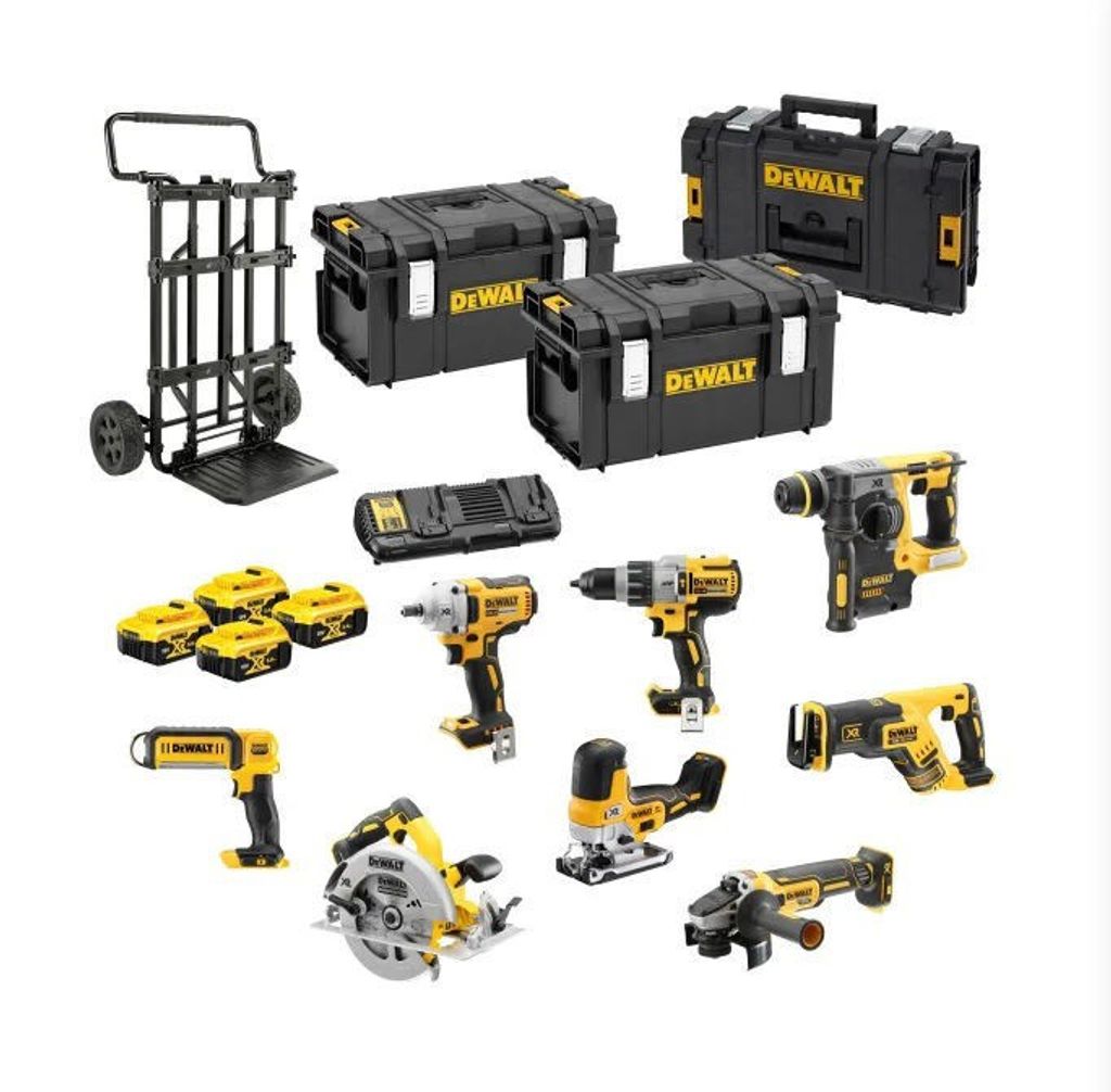 Verktygspaket på 18 V innehållandes DCD996 slagborrmaskin, DCF894 mutterdragare, DCG405 vinkelslip (125 mm), DCH273 borrhammare, DCS367 tigersåg, DCS570 cirkelsåg, DCS335 sticksåg, DCL050 LED-lampa, fyra 18V 5. 0Ah-batterier, snabbladdare, kärra och tre Toughsystem-förvaringslådor.