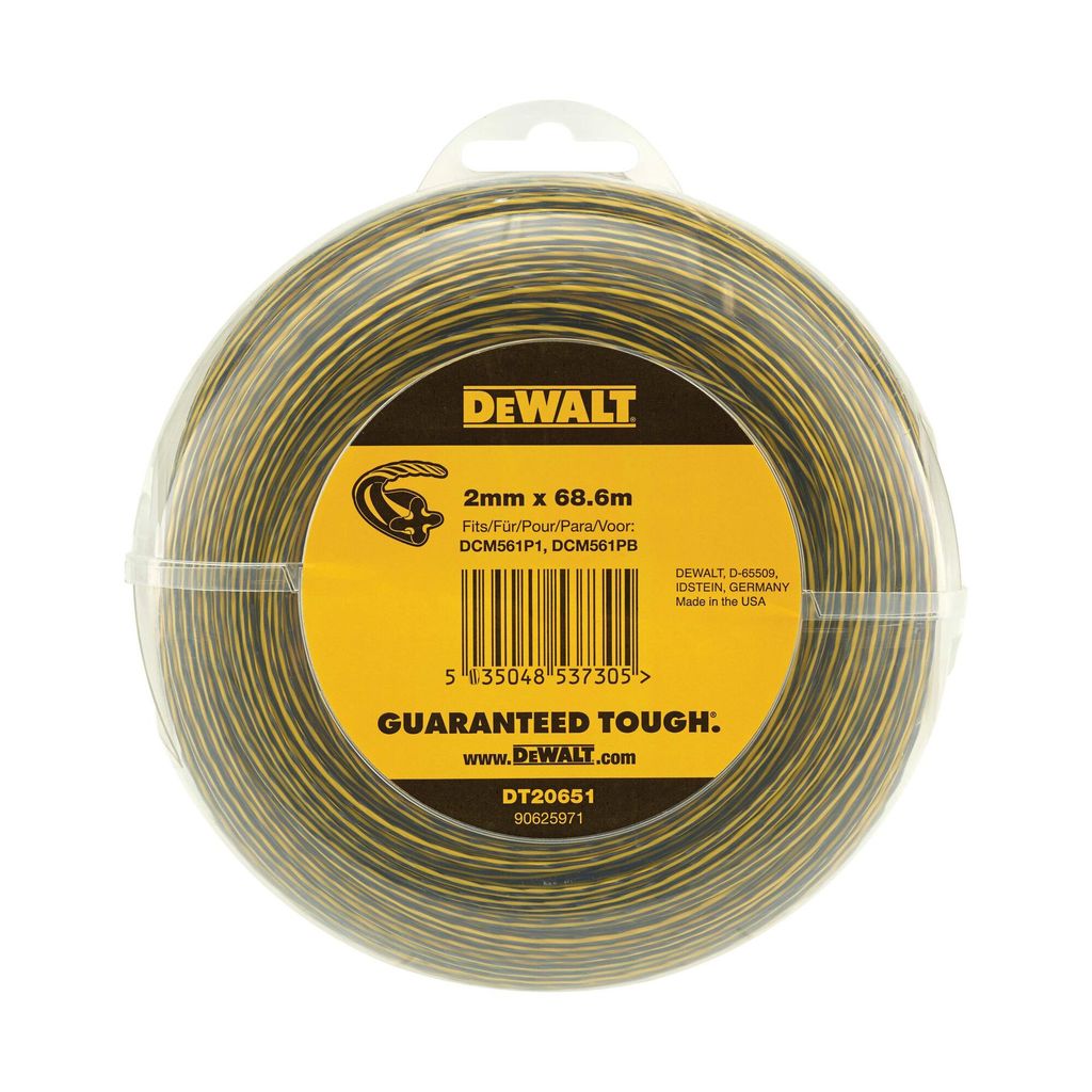 DeWalt trimmertråd med 2mm tjocklek som är 68,6m lång och som passar till DeWalts batteridrivna trimmer DCM561.