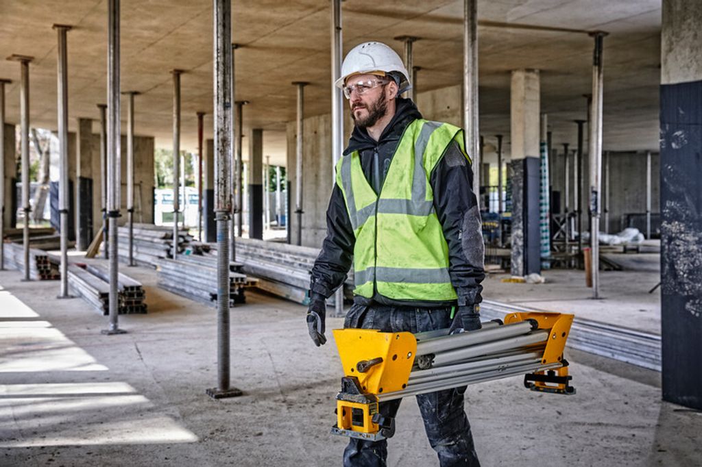 DE7033 är ett lätt men robust stativ i aluminium som är gjort för daglig användning. Baslängden på 1,1 m dras enkelt ut till 2,5 m och ger effektivt stöd även för långa arbetsstycken. Integrerade fällbara ben sparar uppsättningstid och det ergonomiska bärhandtaget gör förflyttning enkel mellan stationer. Uppläggningsstöden fungerar även som ändstopp, vilket ger repeterbar precision och bättre flöde i kapserien.