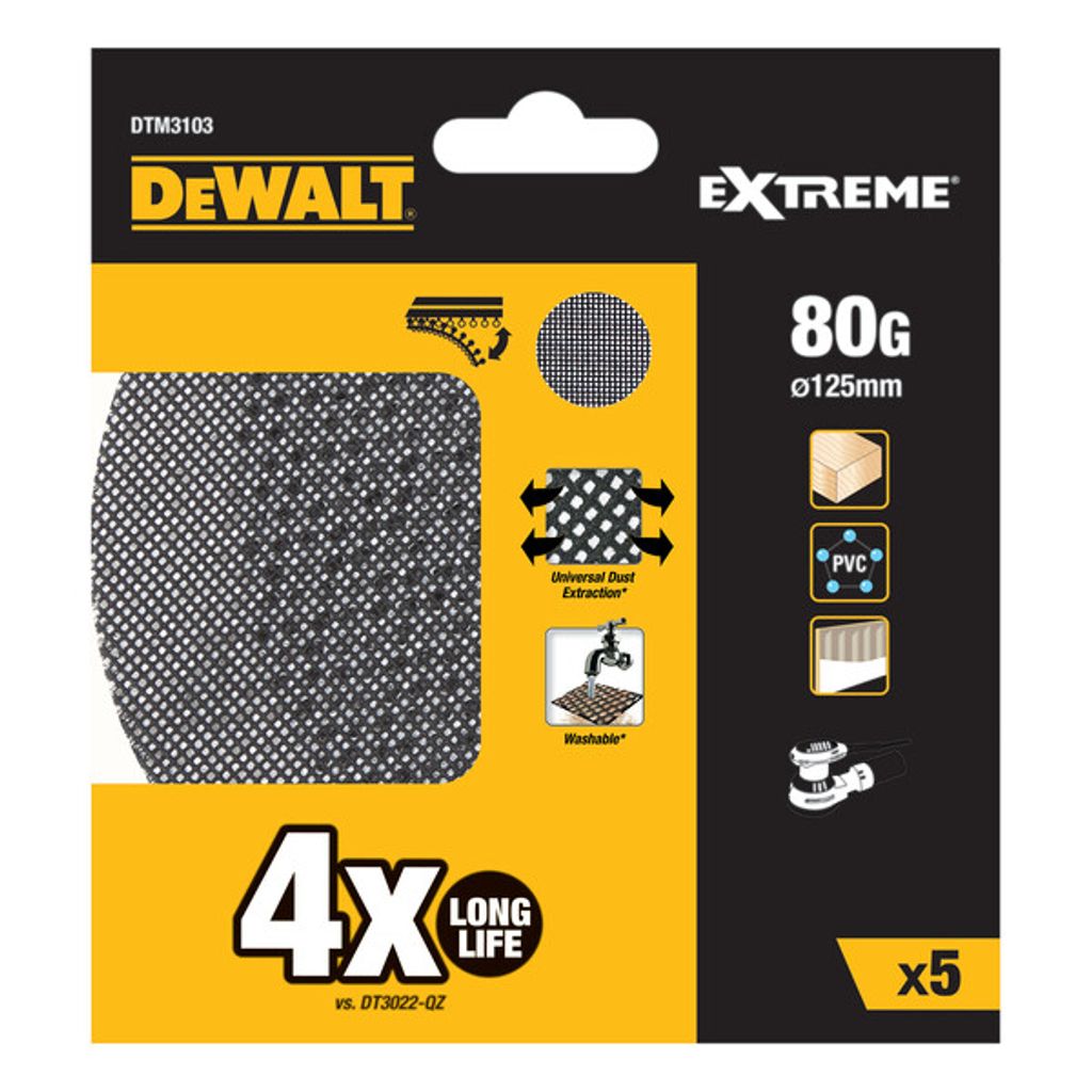 DeWalt 125 mm slipnät ger upp till fyra gånger längre livslängd än traditionella slippapper. Det innovativa nätmaterialet ger förbättrad slipeffekt och överlägsen dammhantering över hela ytan. Slippappret kräver inte hålmatchning och kan enkelt rengöras och återanvändas, vilket sparar både tid och pengar. Levereras i 5-pack.
