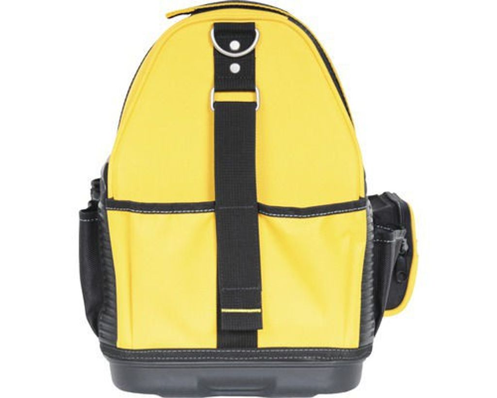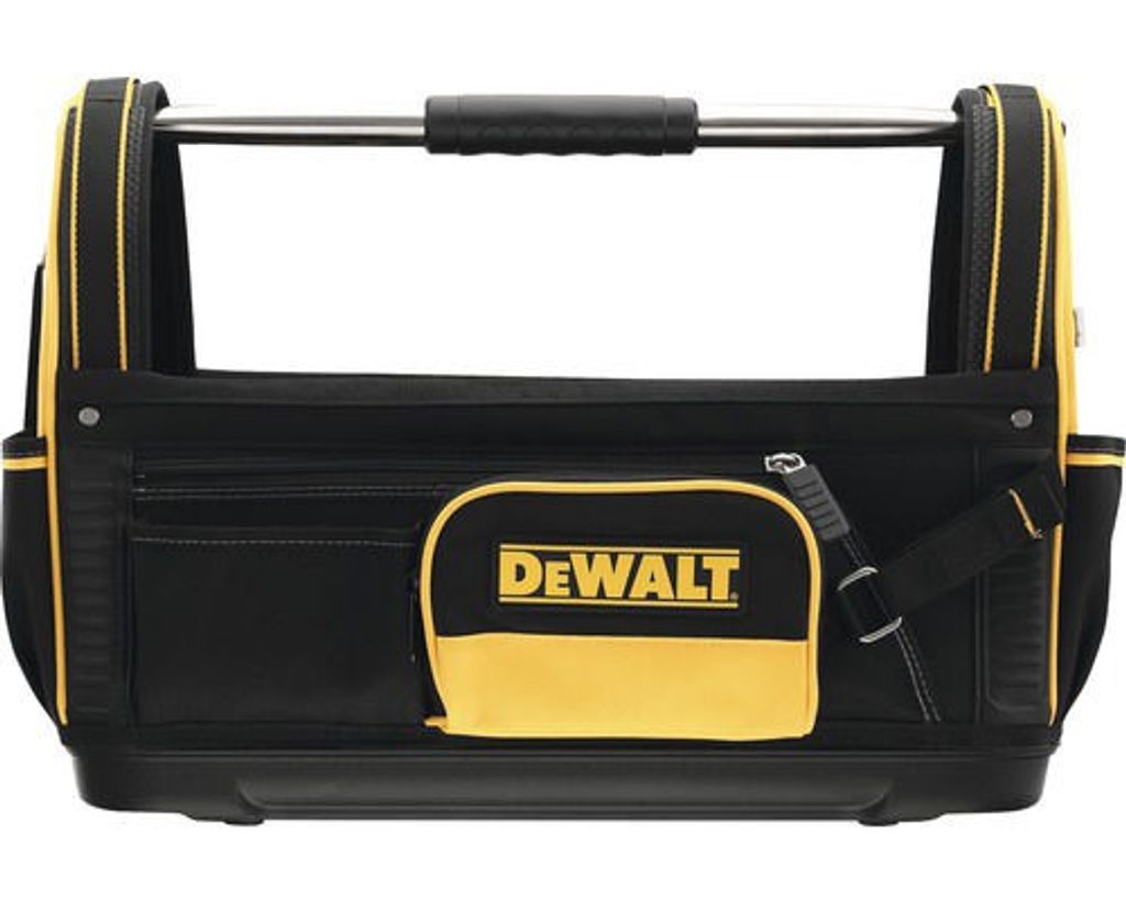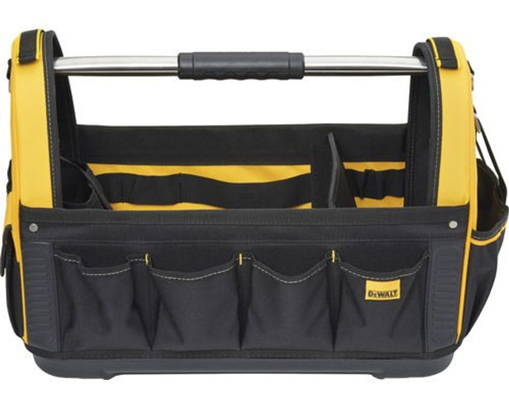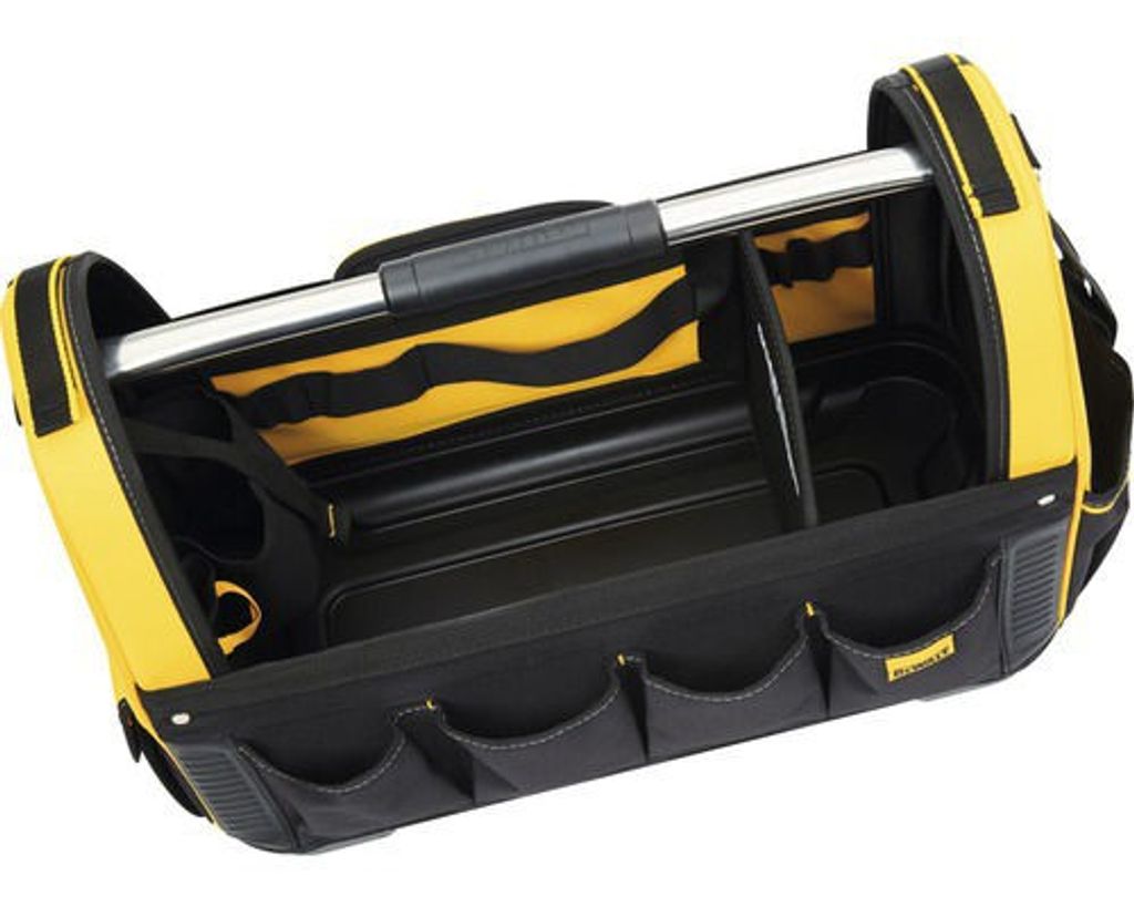 Praktisk verktygsväska i öppen design med inner- och ytterfack, ergonomiskt handtag och axelband.