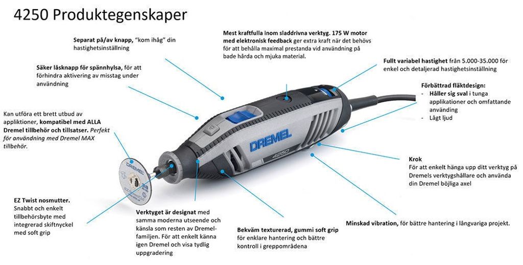- Höga prestanda för uppgifter med hög effekt. Dremel 4250 har högst prestanda av alla verktyg med sladd i Dremel-serien.