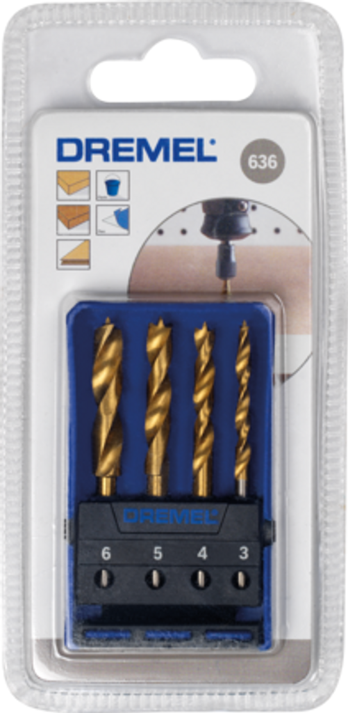 Dremels set med precisionsborrskär för trä innehåller 4 borrskär med centreringsspets för borrning i trä. Innehåller borrskär med diametrarna 3, 4, 5 och 6 mm. Titanbeläggning höjer prestanda och ökar livslängden.