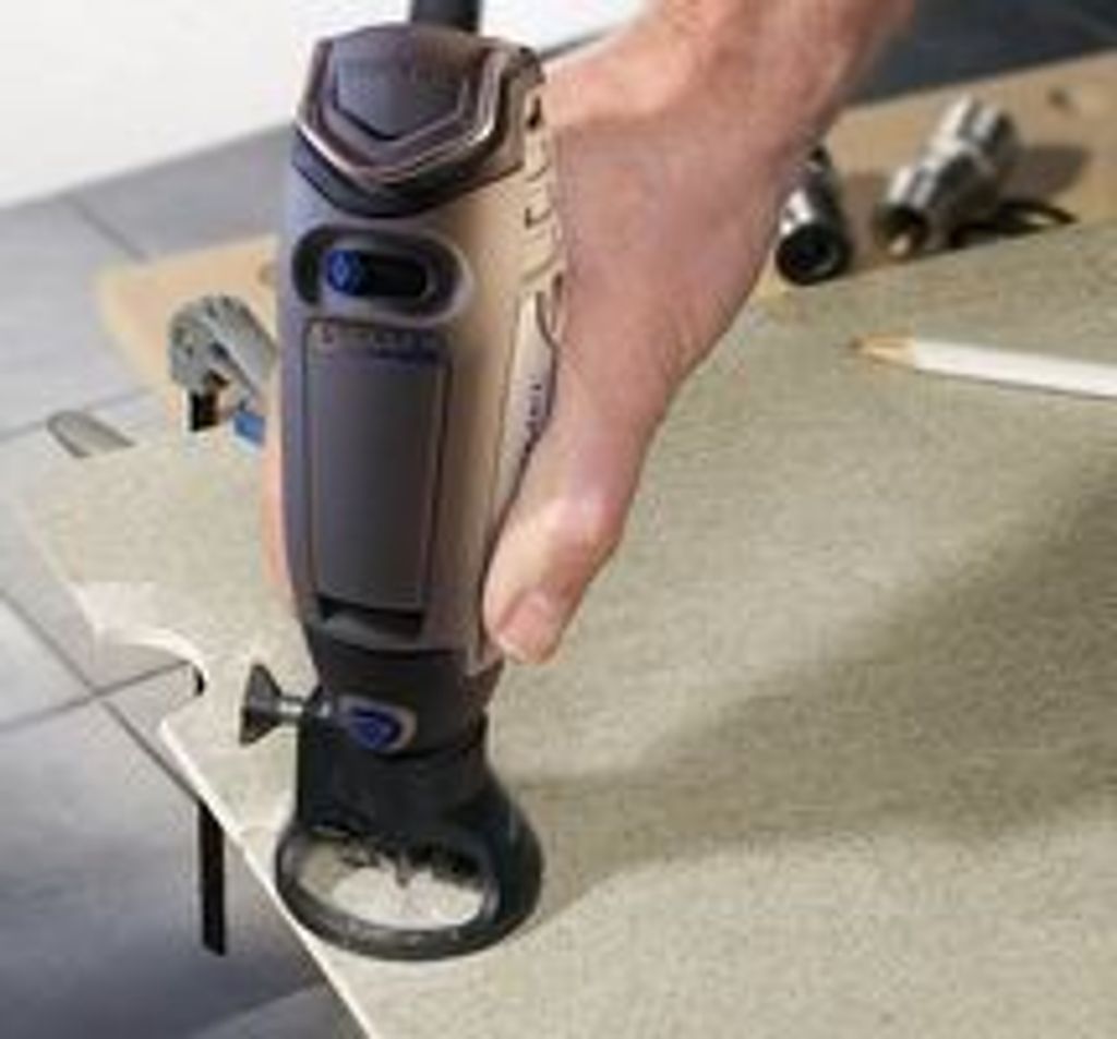För in och skruva åt ditt valda tillbehör innan du skruvar fast frästillsatsen på ditt Dremel multiverktyg. Justera djupet och börja arbeta på ditt material med två händer. För bäst skärning och maximal säkerhet ska du alltid dra ditt Dremel multiverktyg mot dig och använda de stora hålen på frästillsatsen för att inte förlora ditt arbetsstycke ur sikte.