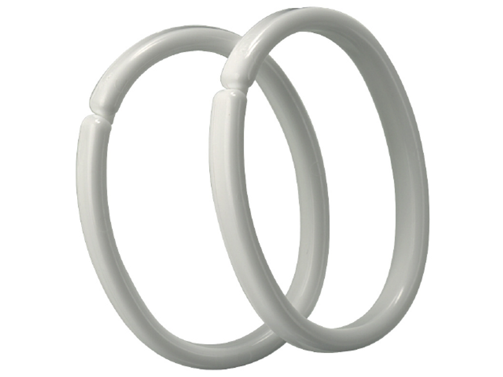 Vita duschdraperiringar i plast.