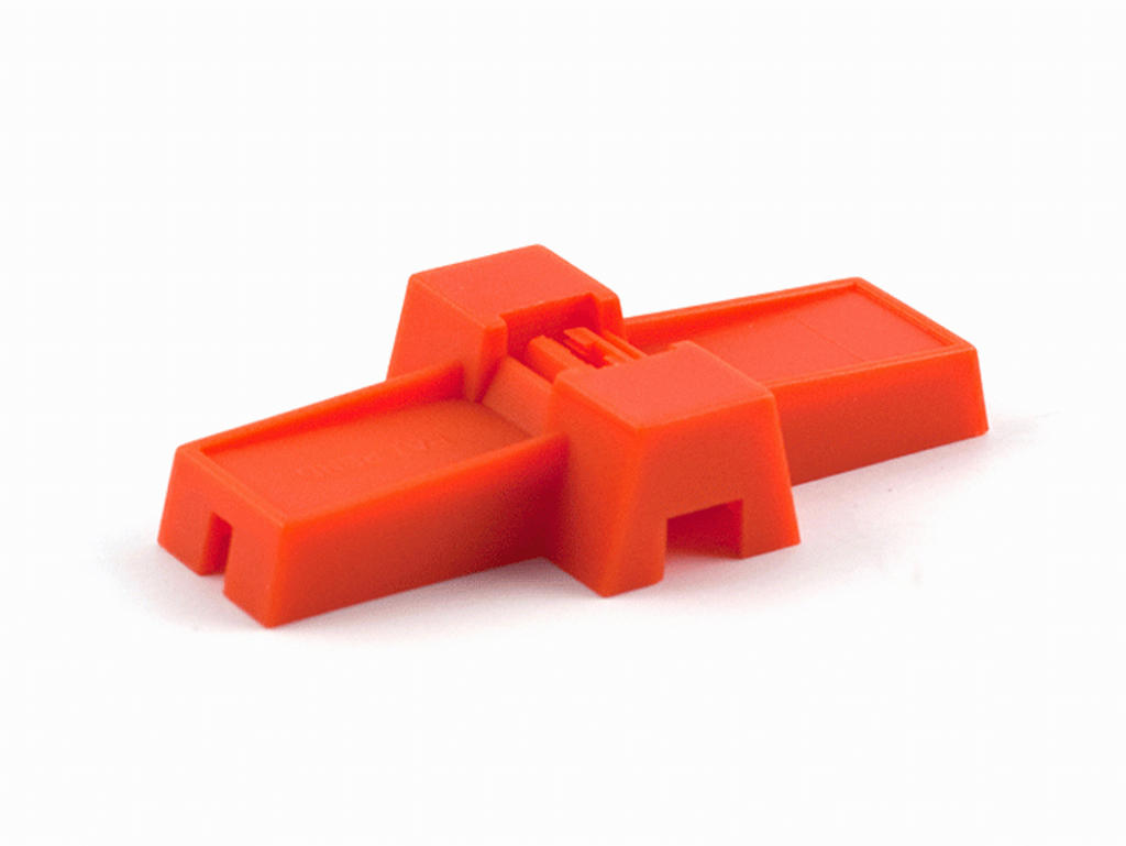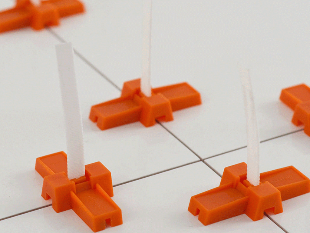 Nivåhatten sätts på nivåbanden och spänns med monteringspistolen tills plattorna ligger i nivå med varandra. Går att återanvända.