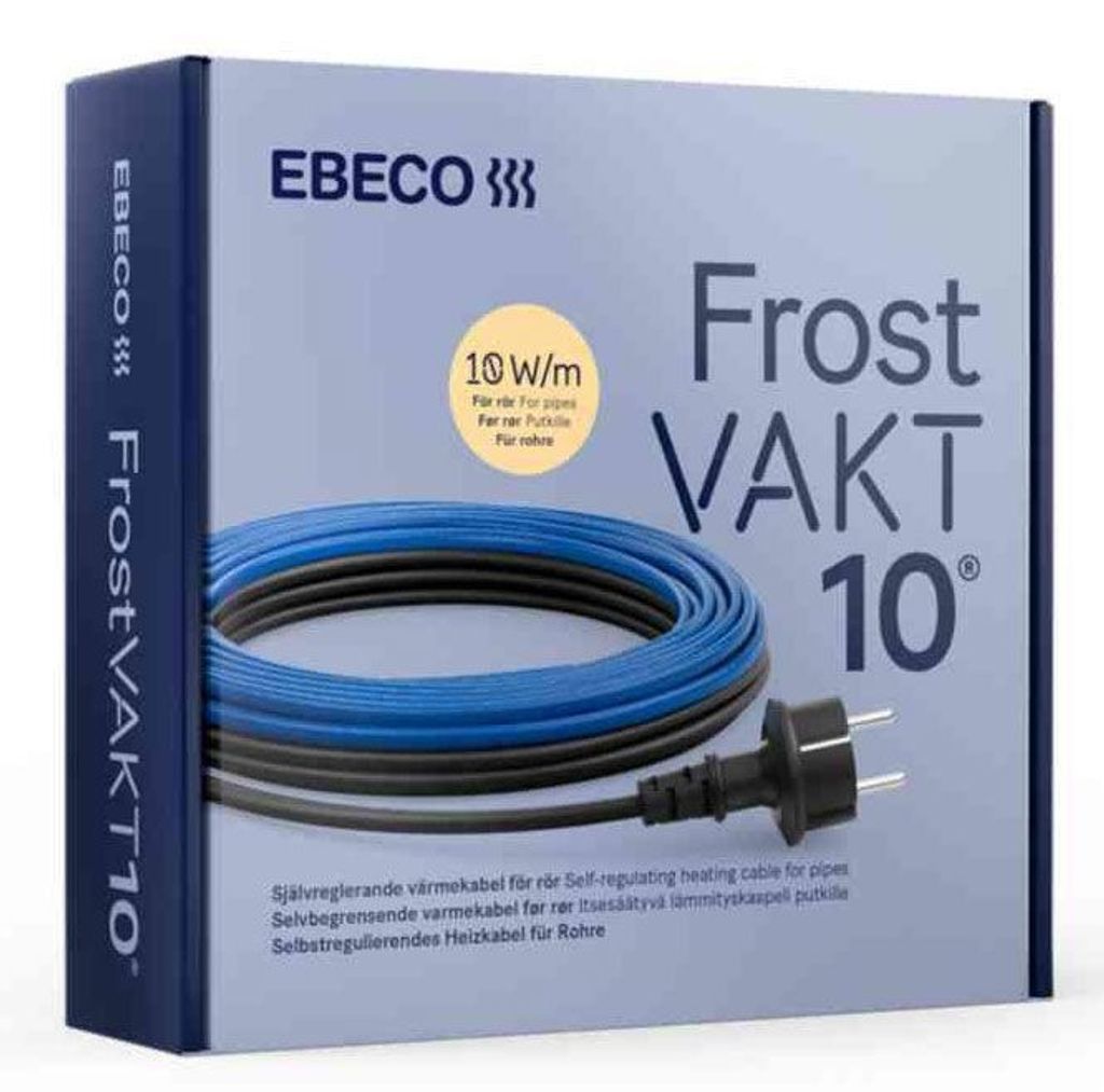 Ebeco Frostvakt 10 är fri från PVC, vilket gör den lämplig för användning med dricksvattenledningar. Den är utformad för att skydda ett 32 mm rör med 20 mm isolering ner till -30°C vid invändig förläggning och -20°C vid utvändig förläggning på plast- eller metallrör. För ökad effekt kan kabeln förläggas dubbelt eller i spiral.