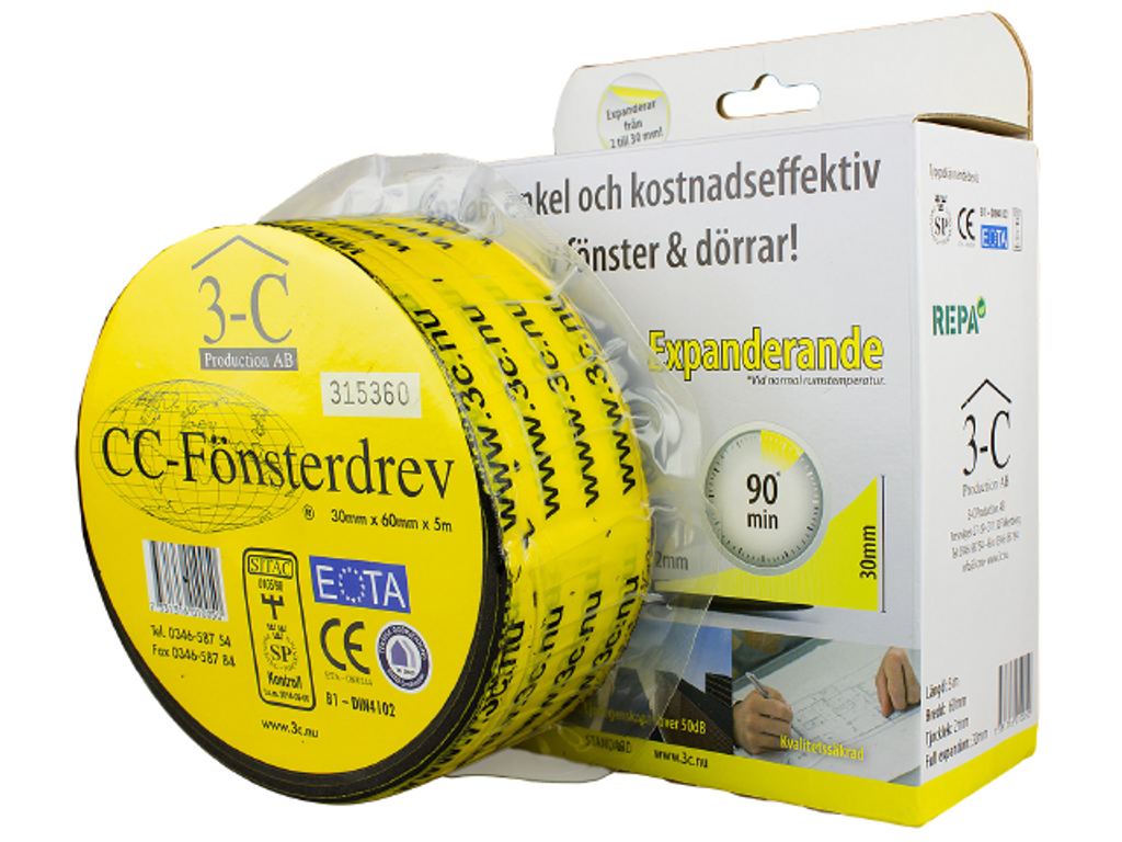 ETAB Fönsterdrev av impregnerad skumplast som expanderar från 2 mm till 30 mm tjocklek. Används i spalten mellan karm och sidostycke. Vid normal rumstemperatur expanderar remsan till sin fulla tjocklek på 1-3 timmar. Finns med eller utan akrylhäftämne.