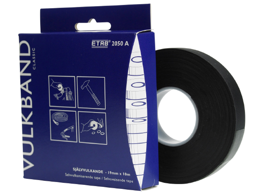 ETAB Vulktejp 2050A 19MMX10M Svart, Självvulkande tejp av PIB (Polyisobutylen), med skyddsliner. Sammansmälter till en homogen massa inom några timmar. Bör skyddas av mjuk plasttejp/eltejp vid risk för nötning eller påverkan av UV-ljus och fuktigt väder.