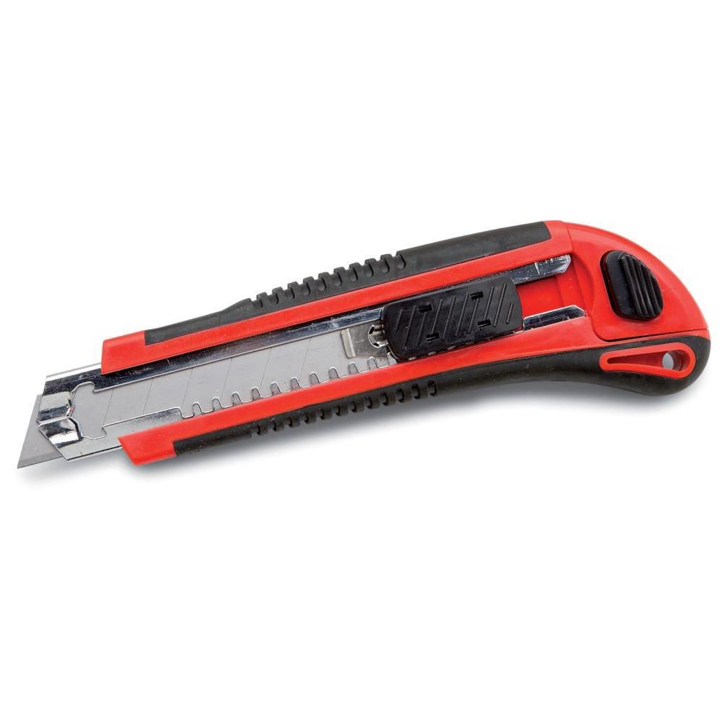 Plasthandtag med inlägg av gummi för ett säkert grepp. Bladet kan låsas med en säkerhetsspärr.