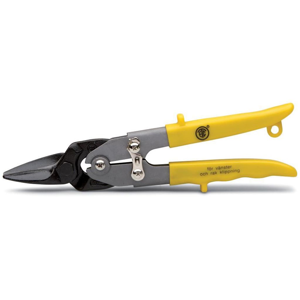 Plåtsax tillverkad av kromvanadiumstål. Käftarnas utformning medger förutom raka snitt även klippning av vänstersväng.