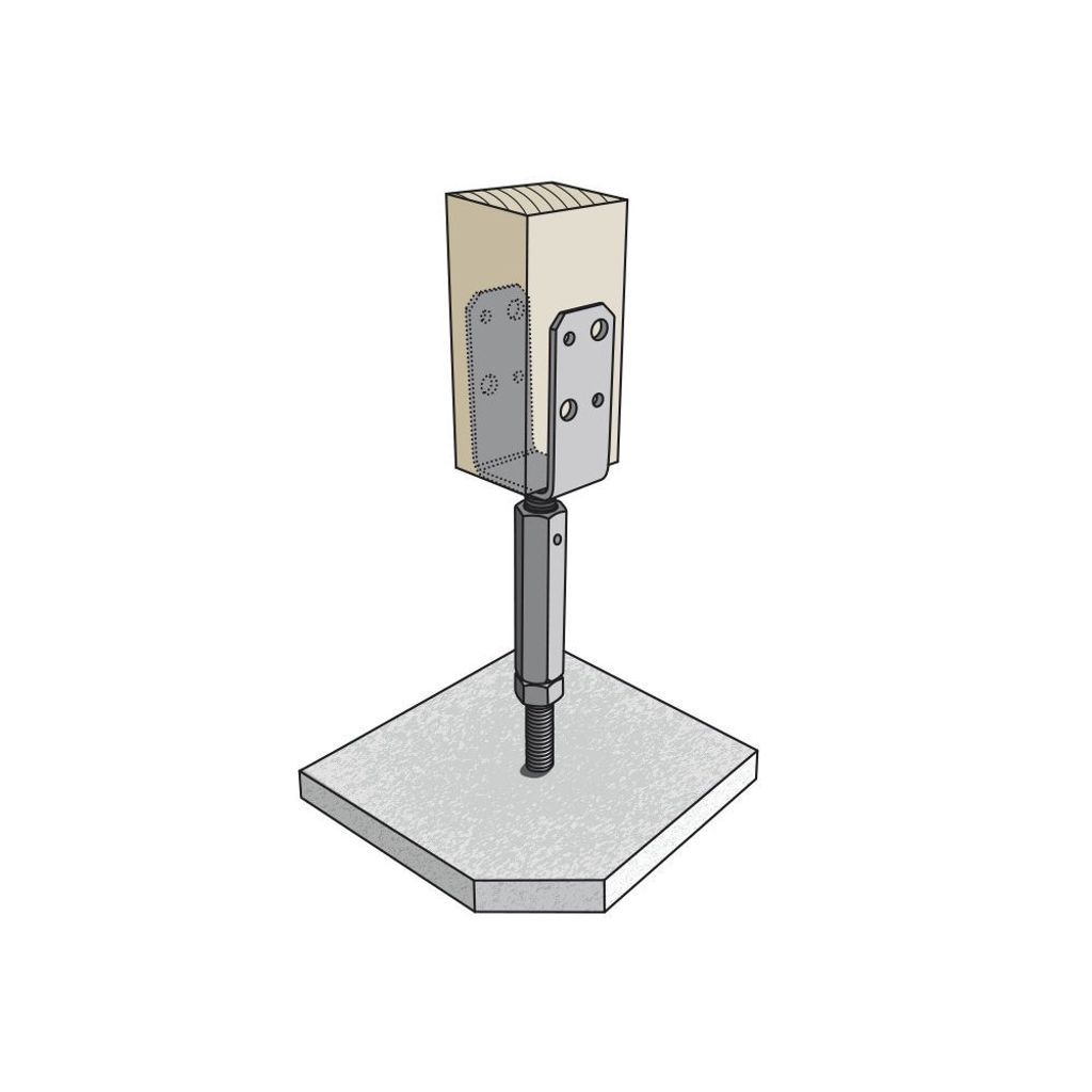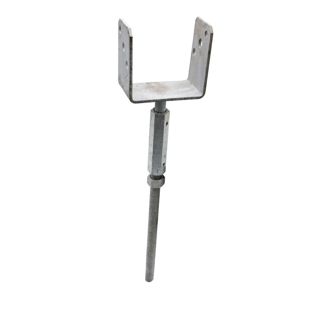 Stolphållare CSAH är justerbar i höjd med hjälp av en vänster-/högergängad långmutter. Används för ingjutning i betong vid infästning av stolpar, till exempelvis staket, pergola och carport.