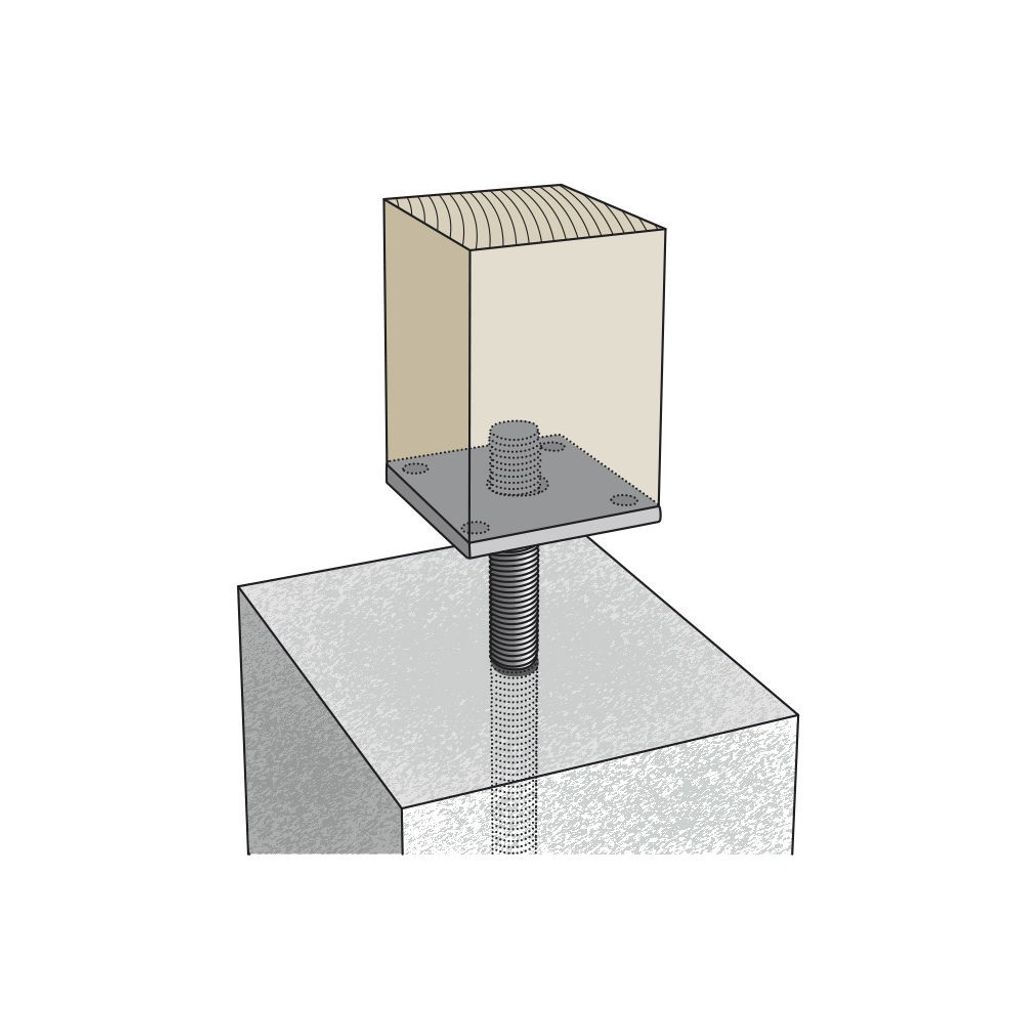 Stolphållare CSSP med justerbar höjd, för ingjutning i betong. I stolpen borras hål för M20 gängstång vilket ger möjlighet att justera stolpskon i höjdled.