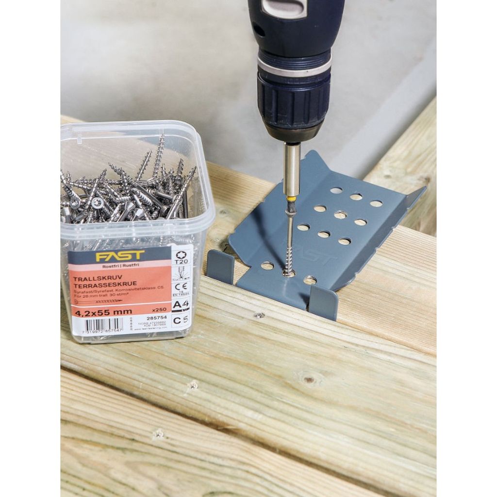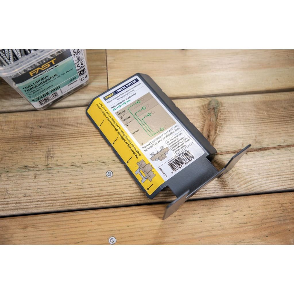 FAST Deck Mate är en skruvmall som ger perfekta rader vid läggning av ditt trädäck. Den är anpassad för trallbrädor med bredderna 95/120/145 mm och minskar risken för sprickbildning vid ändträet.