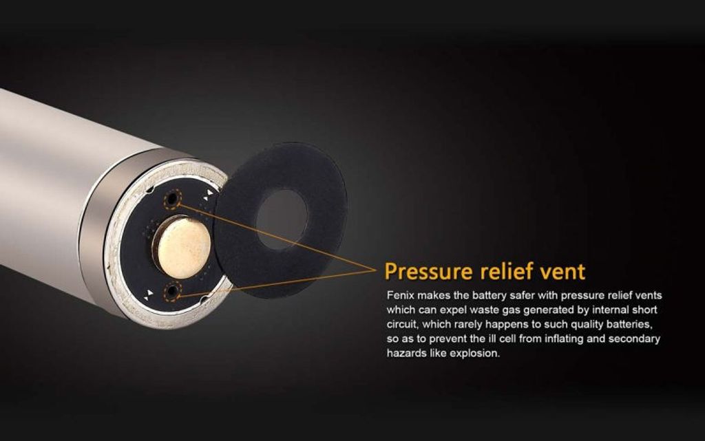 Fenix ARB-L18-3500 är ett högkapacitets 18650 Li-ion laddningsbart batteri med en skyddskrets i anoden för att förhindra kortslutningar, över laddning / urladdning och överuppvärmning. Batteriet innehåller också tryckavlastningsluftar som släpper ut spillgas i det sällsynta fallet med en intern kortslutning som förhindrar explosion.