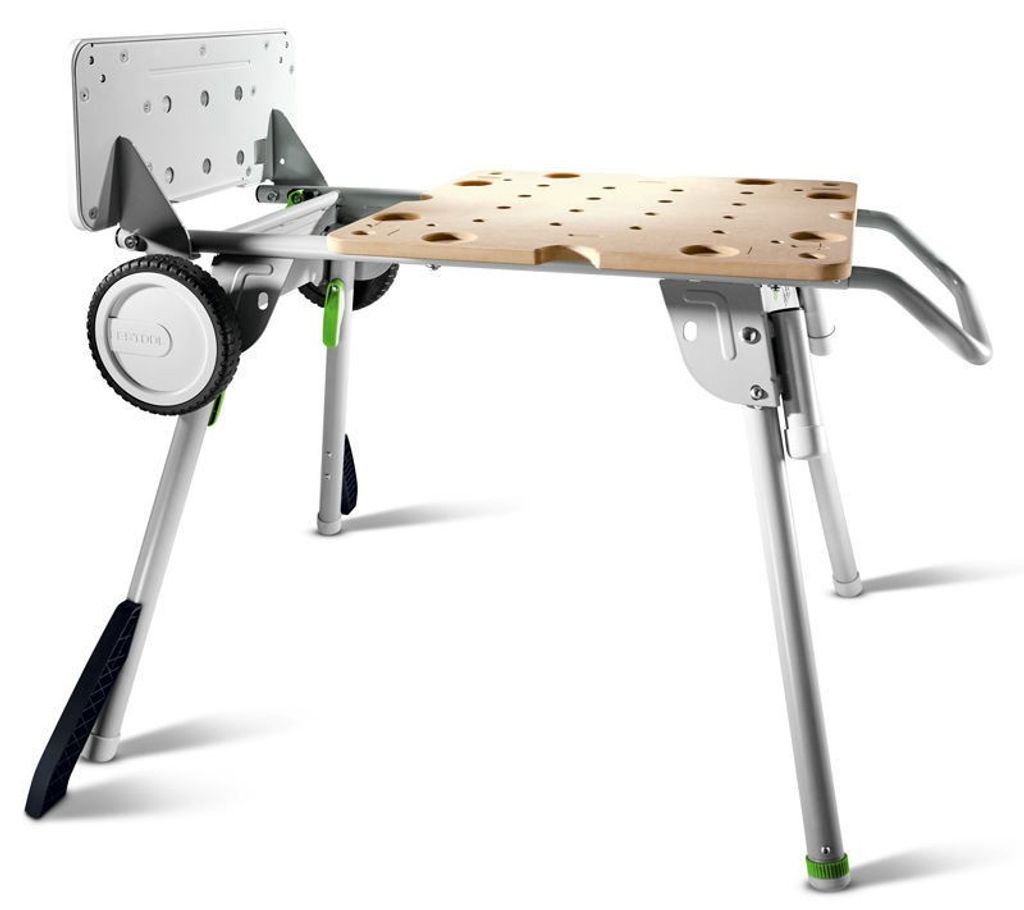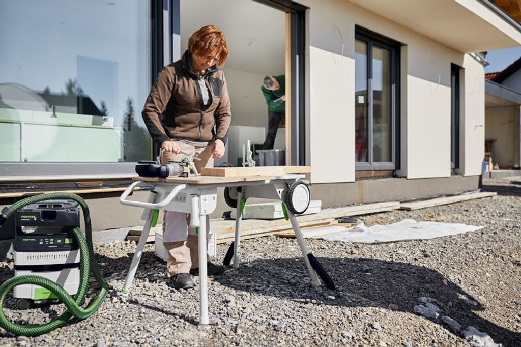 Med sin smarta hålbild i arbetsytan kan arbetsobjekt fixeras med Festool spänn- eller enhandstvingar, vilket ger stabilitet och precision vid sågning. För användning med den batteridrivna bordssågen CSC SYS 50 erbjuder stativet en ergonomisk arbetshöjd på 90 cm. Vid golvnära arbete kan benen enkelt fällas in för en lägre arbetshöjd på 24,5 cm, vilket gör den optimal för exempelvis golvläggning.