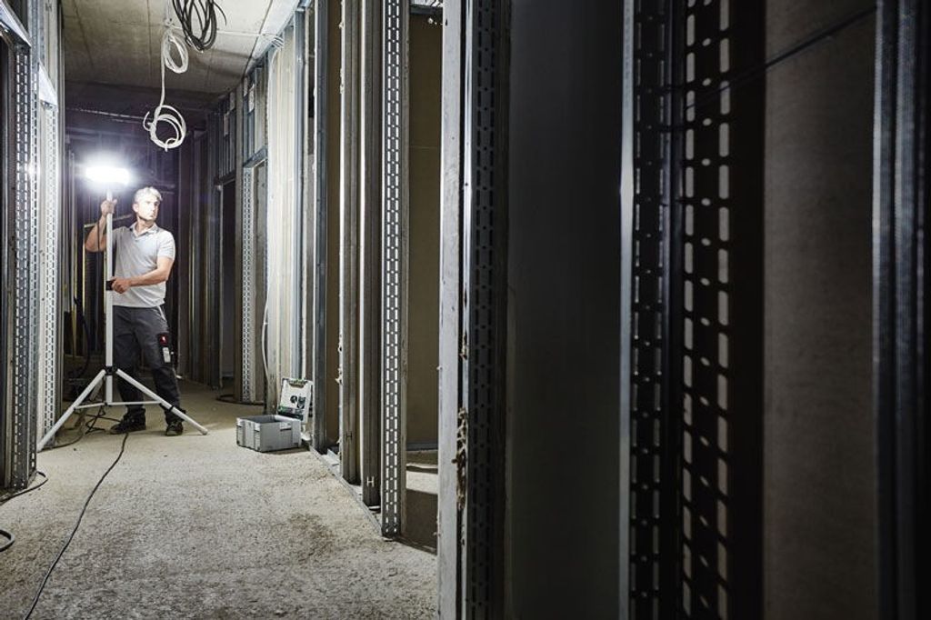 Lyser upp stora ytor (nätdrift) i hela rum med en kvalitet som liknar dagsljusets. Och kan användas med största möjliga flexibilitet: stående på golvet eller andra ytor, monterad på Festools stativ eller hängande i kroken på baksidan.