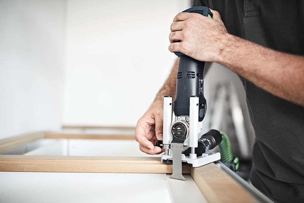 - Genomtänkt: valfritt systemtillbehör för exakta sänksnitt och dammfri sågning – till och med ovanför huvudet