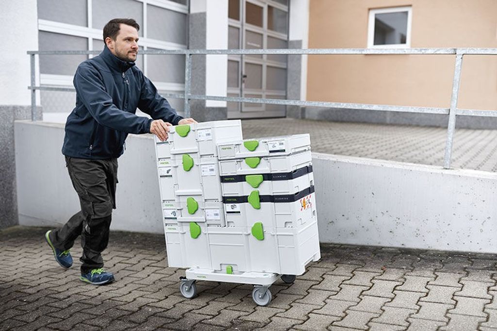 Rullvagnen är kompatibel och kopplingsbar med alla SYSTAINER³ och SYSTAINER T-LOC tack vare vredet i mitten.