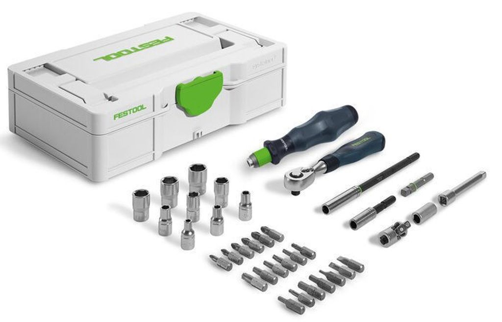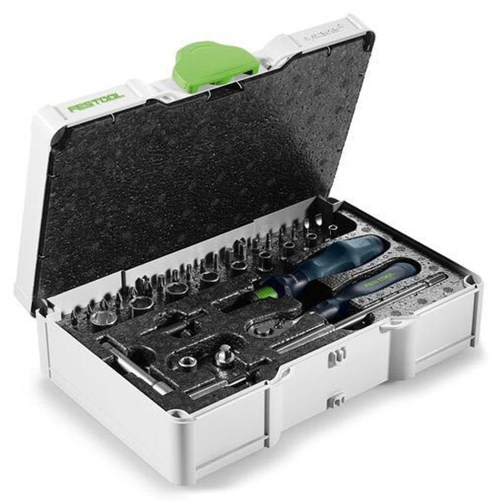 Festool Spärrskaft-set SYS3 S 76-1/4"-CE RA är den ultimata lösningen för alla monteringsbehov. Detta 37-delars set innehåller en rad högkvalitativa verktyg, inklusive spärrskaft, nyckelhylsor från 4 till 13 mm, en kardanknut för svåråtkomliga områden samt ett urval av bits och förlängare. Med detta set är du väl rustad för att hantera en mängd olika skruv- och monteringsarbeten, från möbelmontering till installation av kök.