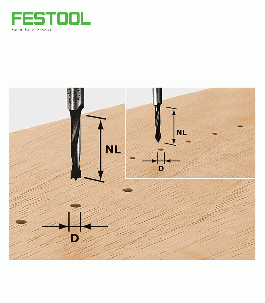 Festool tappborr - plugg- och hålradsborr, optimerad för överfräsar vid höga fräsvarvtal.