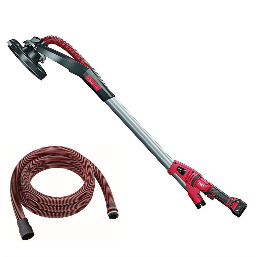 Arbetsmiljön blir renare tack vare effektivt dammutsug mellan borstkrans och slipplatta som motverkar igensättning av slipmedel. Maskinen är förberedd för FLEX säkerhetsdammsugare via Clipsystem på styrröret och har dammskyddad strömbrytare. För extra räckvidd finns ett förlängningsrör på 500 mm som monteras utan verktyg. LED display visar batterinivå och FLEX 18,0 V batterisystemet fungerar med alla 18,0 V batterier.