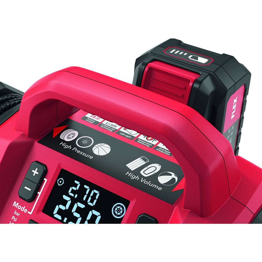 Batteridriven kompressor 12,0/18,0 V. Elektroniska styrsystemet (EMS) skyddar maskinen, förlänger livslängden och ökar effektiviteten. Översiktliga, stora reglage för snabb inställning av funktionerna.