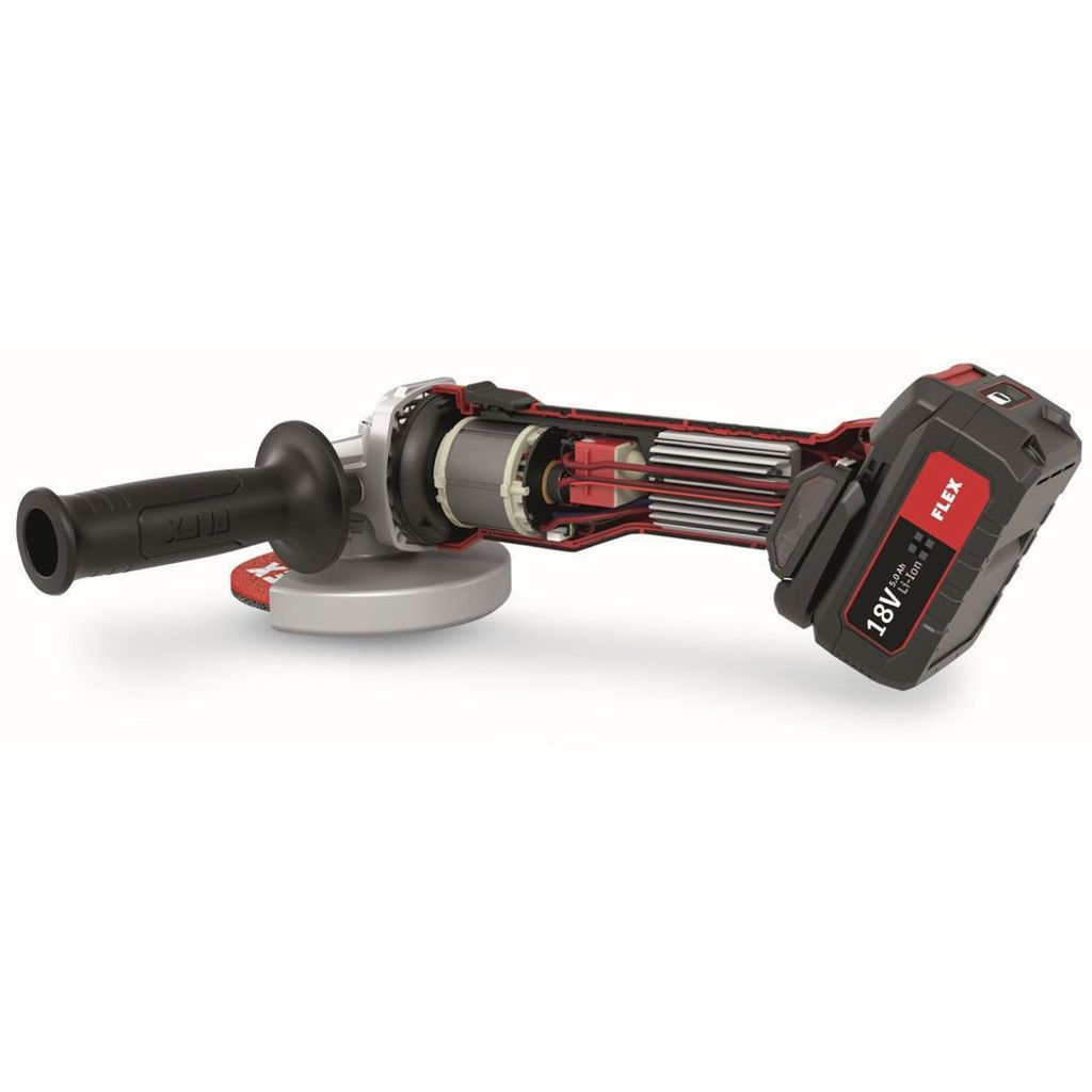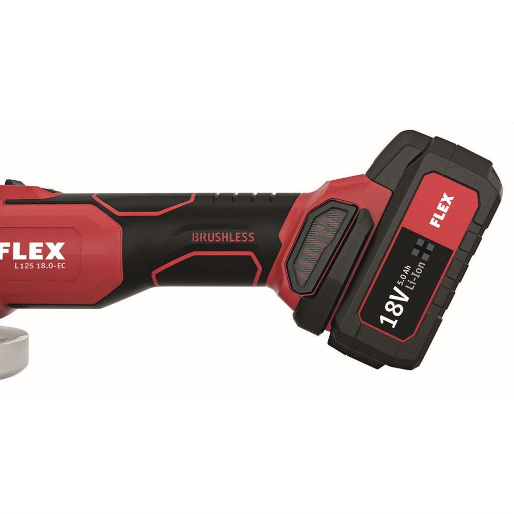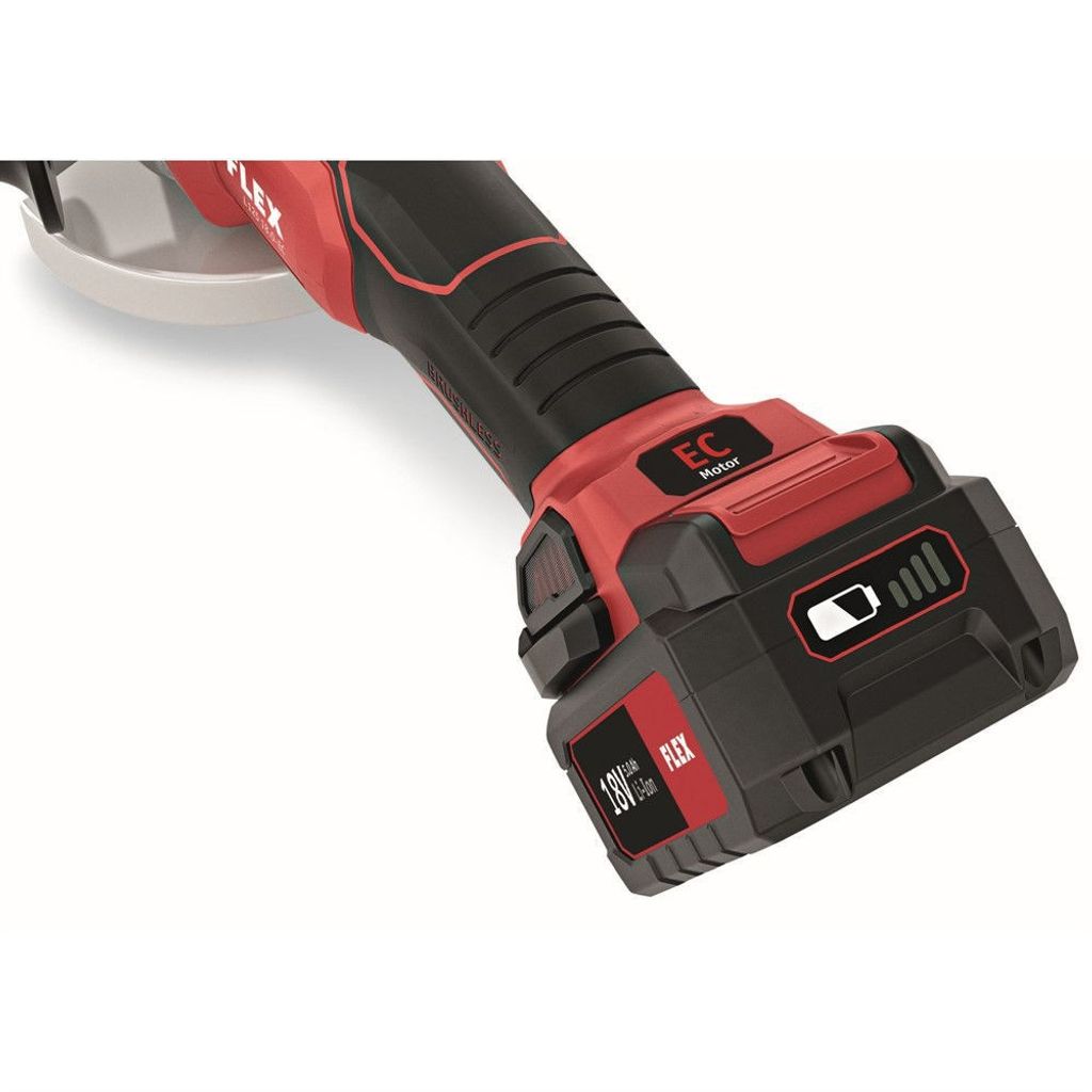 Flex sladdlös vinkelslip 18,0 V, 125mm. Det elektroniska styrsystemet (EMS) skyddar maskinen, förlänger livslängden och ökar effektiviteten. Utrustad med borstlös motor för ökad effektivitet och en längre livslängd.