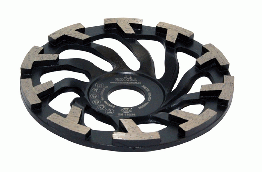 Flexxtra Diamantslipskål för hög avverkning i betong, hård puts, hårt spackel och hålsten. Slipskålen har extra stora hål för dammutsug och kylning. Hög avverkning och lång livslängd.