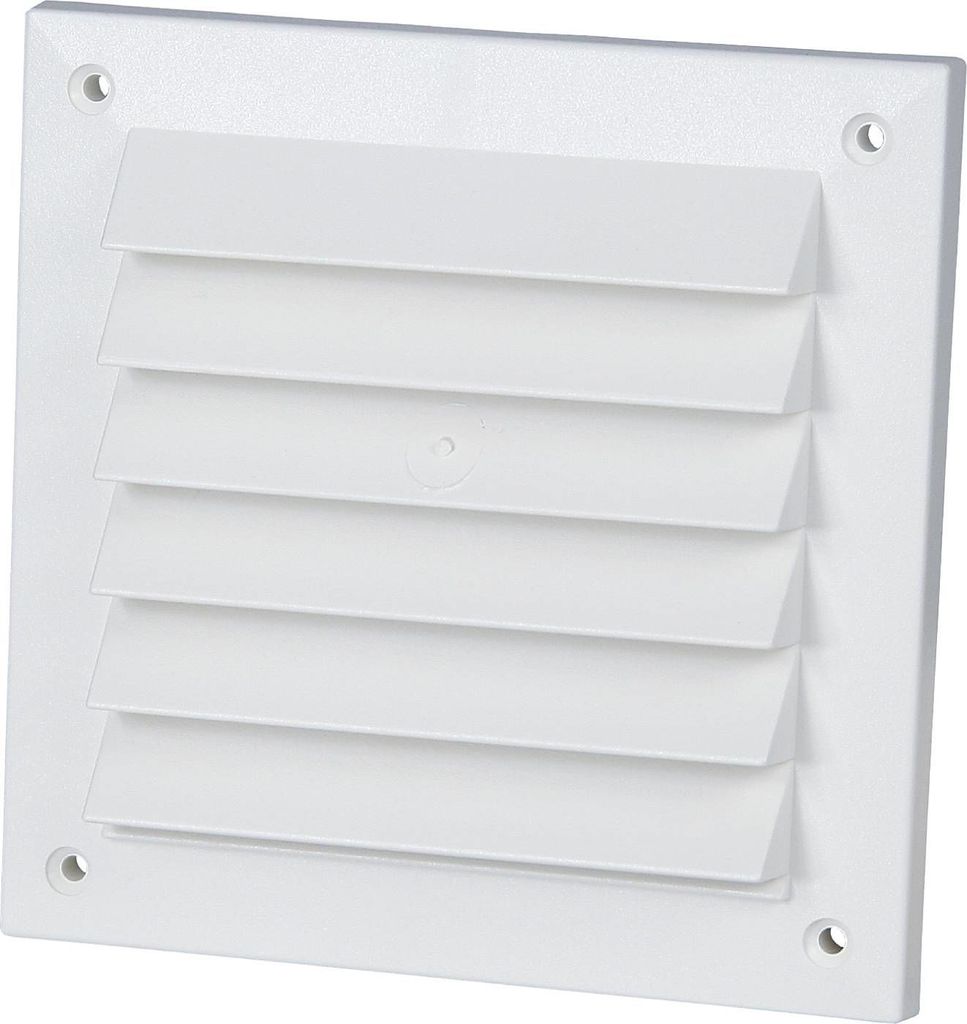 Utvändiga påblåsningsskyddet är utformat som fyrkantsgaller, vilket skruvas eller muras fast i fasaden.