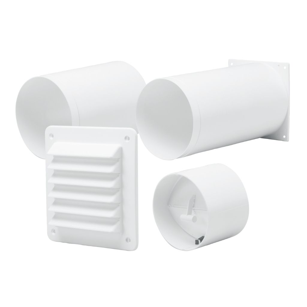 Det kompletta paketet innehåller ett kallrasskydd som minimerar oönskat kallras, ett ytterväggsgaller som skyddar mot väderpåverkan och skadedjur, ett modulrör för luftflödet samt en lång stos för säker anslutning till fläktens utblås. Kitet är dimensionerat för att passa väggar med en tjocklek på upp till 310 mm.