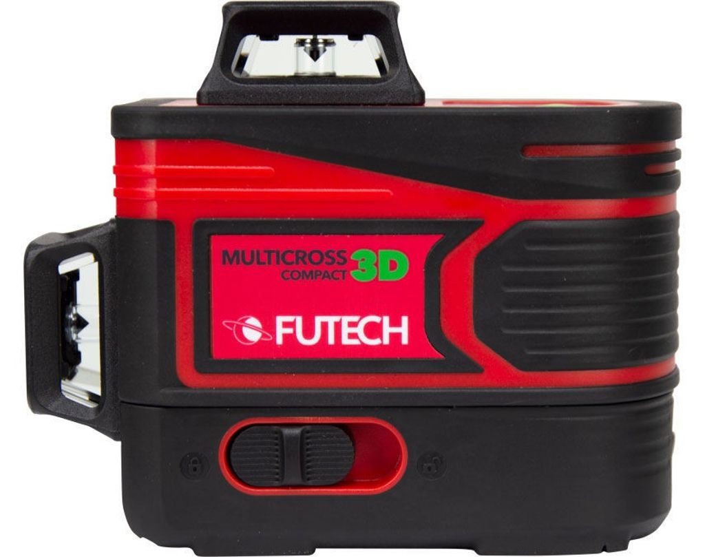 Futech MC3D Pro kompakt 2.0 erbjuder flera praktiska funktioner, inklusive en pendellåsning för att använda lasern i låst läge för valfria vinklar, och fyra 90°-vinklar för mångsidig användning. Den är IP54-klassad för damm- och vattenskydd, vilket garanterar hållbarhet och tillförlitlighet i krävande arbetsmiljöer.