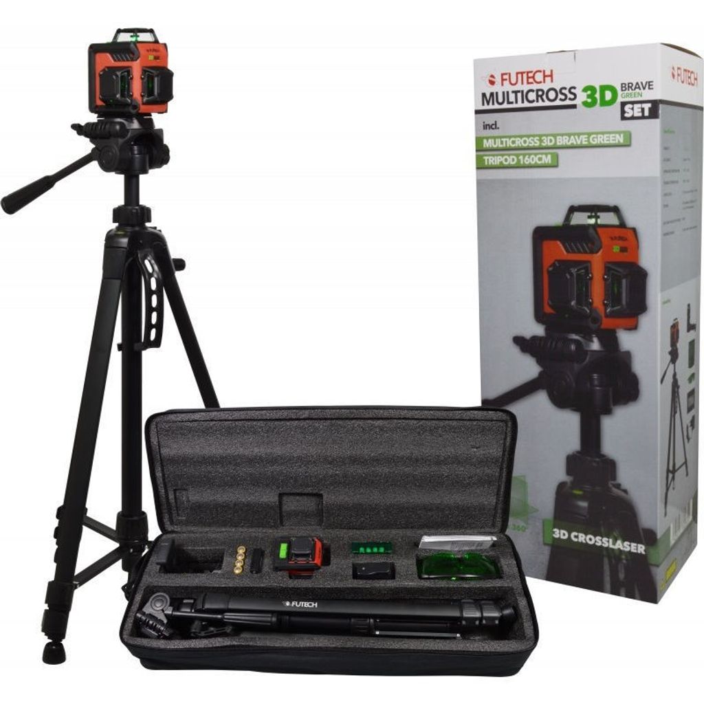 Futech MC3D Brave multilinjelasersats med tiltbar svart kraftig tripod med vev justerbar upp till 160 cm i nylonväska. MC3D Brave är lillebror till MC3D Pro och en självnivellerande grön multikorslaser med 3 x 360°-linjer som ger hög arbetseffektivitet och prestanda på horisontella och vertikala nivelleringsapplikationer i hela rummet samt även lodfunktion.