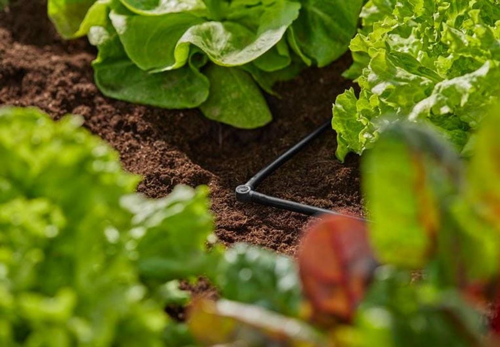 Använd GARDENA L-koppling 4.6 mm (3/16") för att ändra riktning av 4.6 mm Fördelarrör och Droppslang med 90°. Du kommer att kunna nå alla plantor i rabatten med Micro-Drip-Systemet. L-kopplingen tillåter dig också att installera systemet så att det går över krukkanter utan att rören viks.