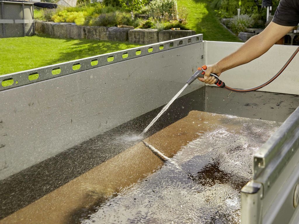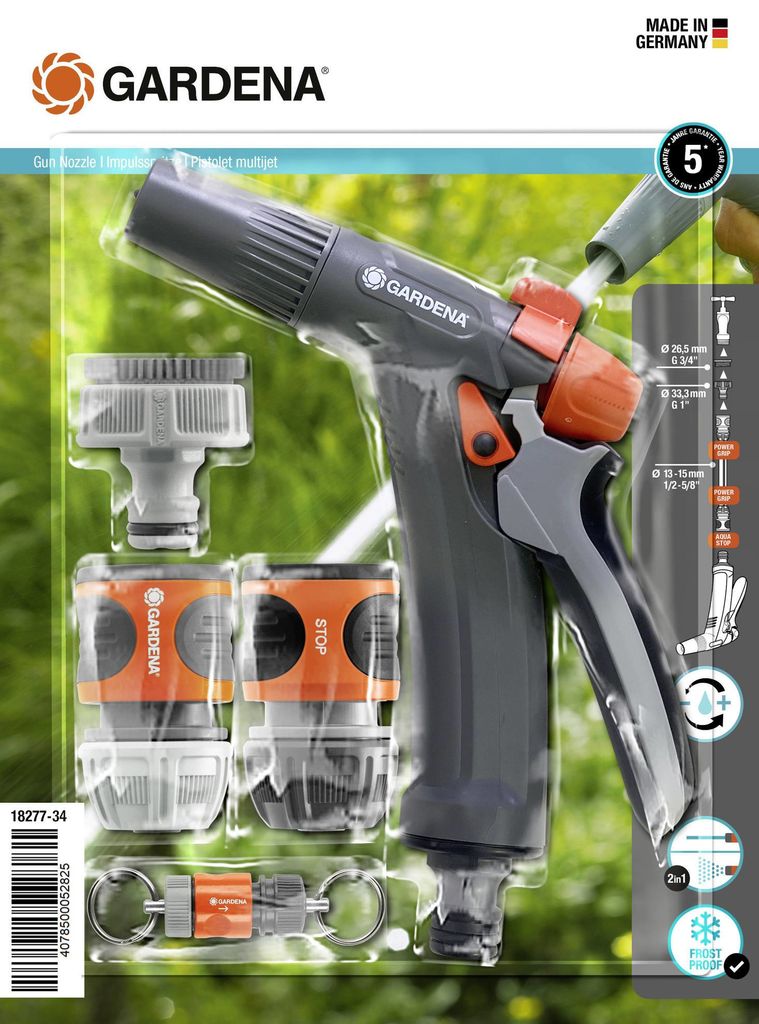 GARDENA Rengöringspistol med anslutningsset. Setet innehåller alla original GARDENA-systemdelar för omedelbar användning av slangen.