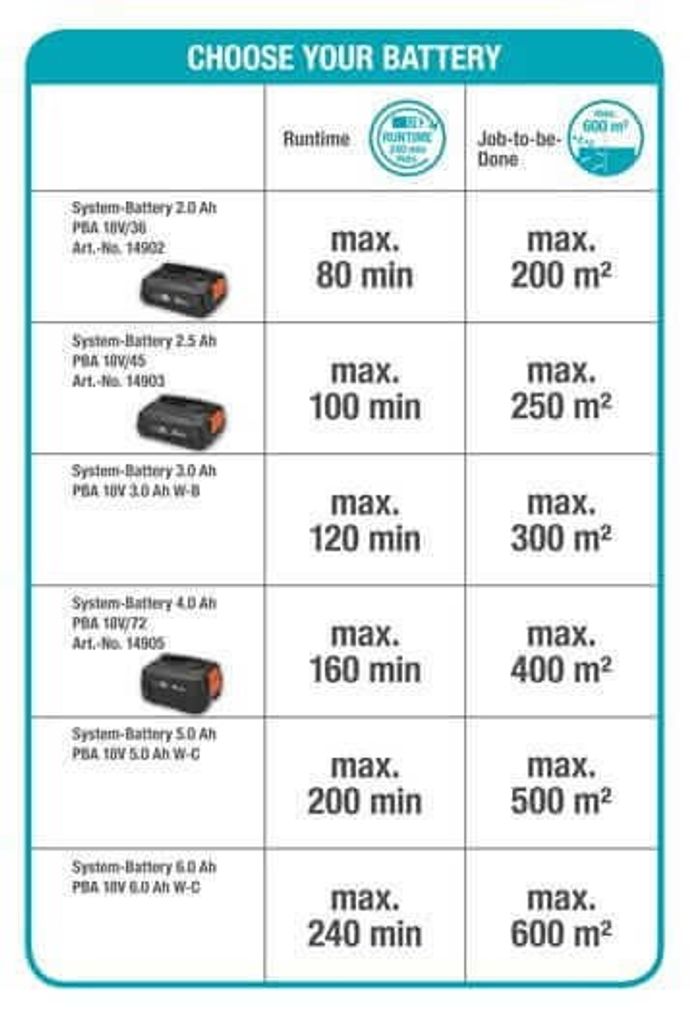- OBS! Levereras utan batteri och laddare. Du kan använda valfritt 18 V-batteri från POWER FOR ALL ALLIANCE. Beroende på vilket batteri du väljer kan körtiden vara upp till 240 minuter eller upp till 600 m² häck.