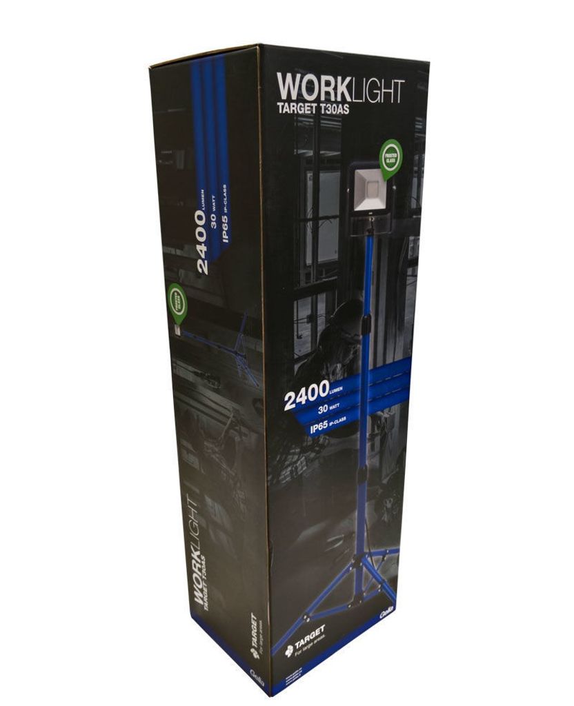 Gelia TARGET T30AS är en robust LED-arbetsbelysning med en 30 Watts vinklingsbar strålkastare och justerbart teleskopstativ (0,85-1,55 m). Dess stabila, plastbeklädda fötter garanterar säker användning, medan det hopfällbara stativet underlättar förvaring och transport. Produkten har skyddsklass IP65 och inkluderar en 2m kabel med jordad stickpropp.