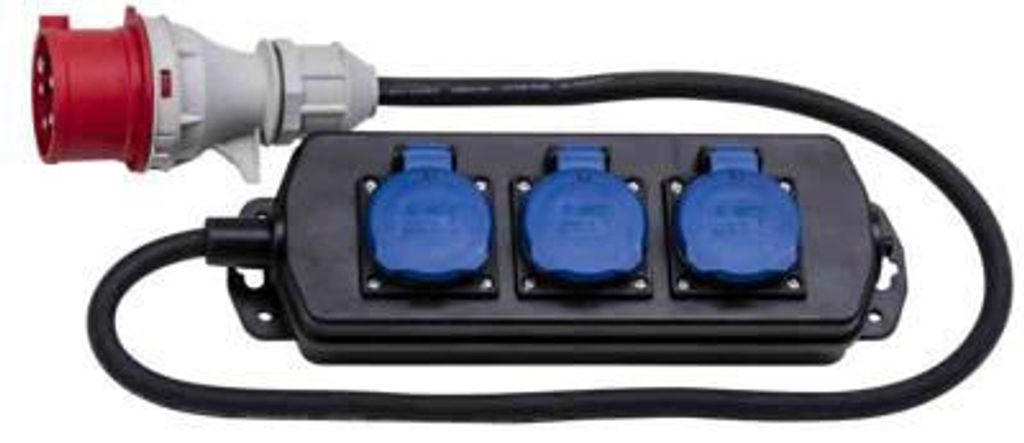 Övergång från 400V till 3x16A 230V Schuko. Varje schukko uttag matas av var sin fas. Uttag 1=L1, Uttag2=L2, Uttag 3=L3. Grenuttag med självstängande lock.