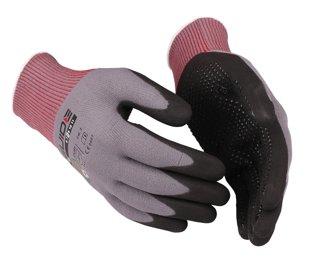 Den sömlösa stickningen i nylon ger en mycket bra passform och hög fingertoppskänsla. Mudden är ribbstickad och gör att handsken sluter åt om handleden. Handflatan och fingertopparna är belagd med mikroporös nitril, med ett förstärkningsmönster, vilket ger ett perfekt grepp och en extra hög slitstyrka. Ökotex-godkänd. Lämplig för montage- och byggindustri.
