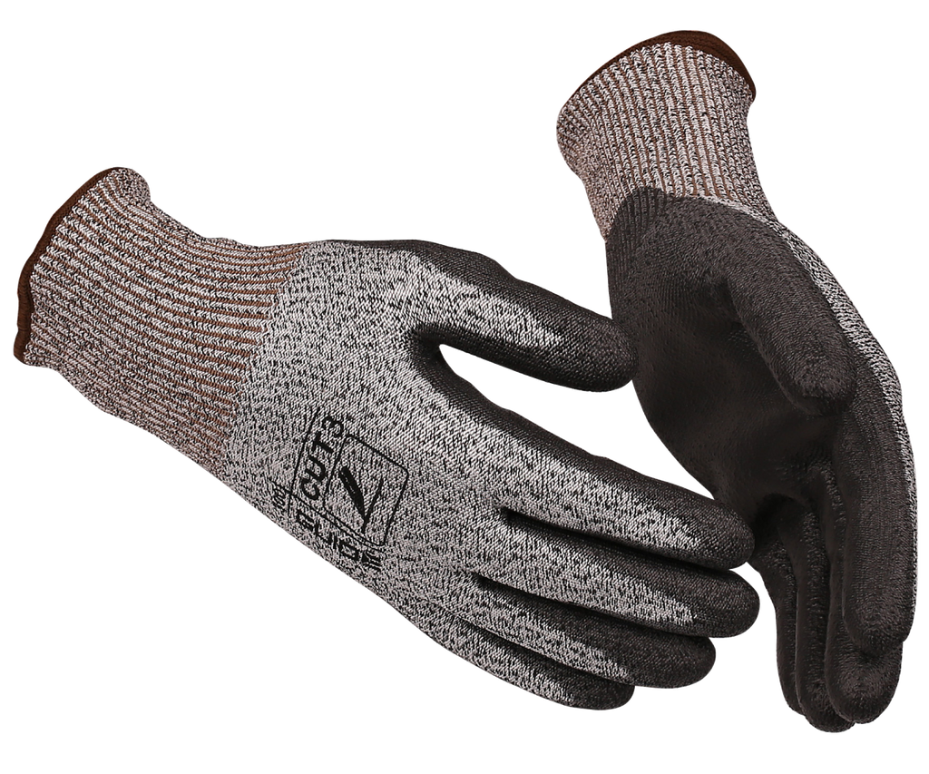 Denna tunna arbetshandske är sömlöst stickad i gråmelerat skärskyddsgarn och har en grå PU-beläggning, vilket ger ett mycket bra grepp, mekaniskt skydd och skydd mot våta och oljiga ytor. Lämpar sig för arbeten där risk för skärskador finns.