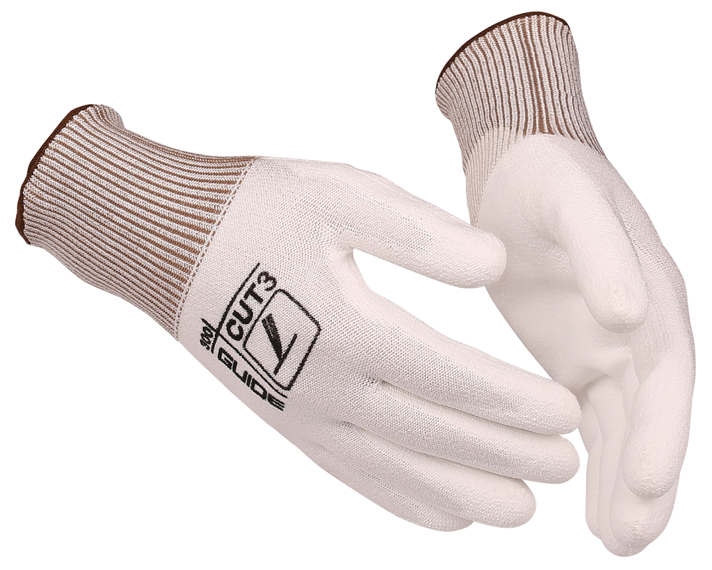 Denna tunna arbetshandske är sömlöst stickad i vitt skärskyddsgarn och har en vit PU-beläggning, vilket ger ett mycket bra grepp, mekaniskt skydd och skydd mot våta och oljiga ytor. Lämplig för arbeten där risk för skärskador finns.