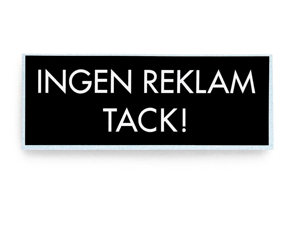 Självhäftande Ingen reklam-dekal. Svart med vit text.
