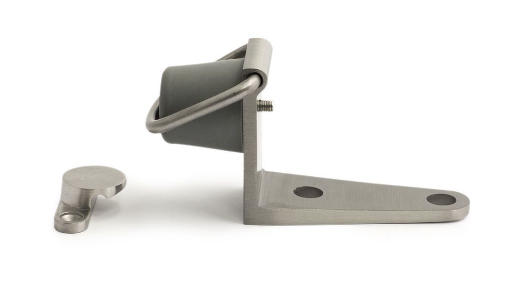 Dörrstopp med gummidämpare och hake av rostfritt stål. Skyddar dörr och vägg från slag och skador.