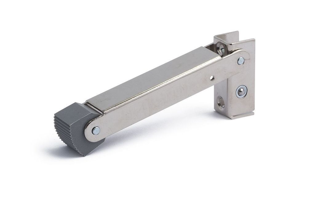 Dörrhållare av stål, utfällbar, med gummibuffert.