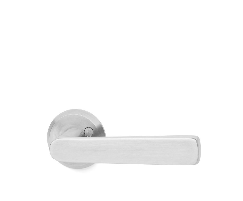 Dörrhandtag av rostfritt stål med dubbelverkande returfjäder avsett för ytterdörr med modullåshus. Massivt handtag med modern karaktär.
