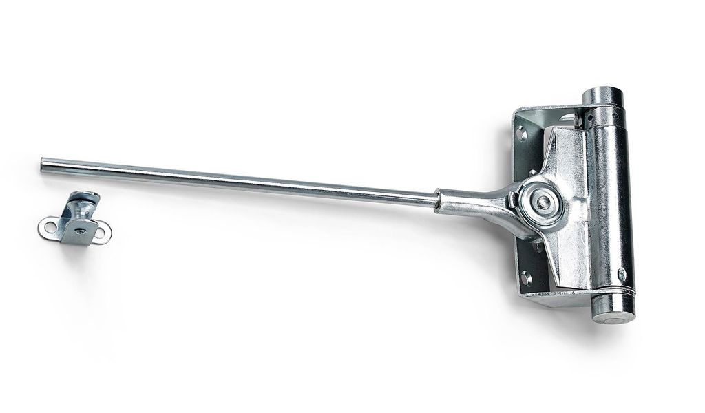 Dörrstängare av stål med fjäderbelastning. Maximal dörrvikt 80 kg.