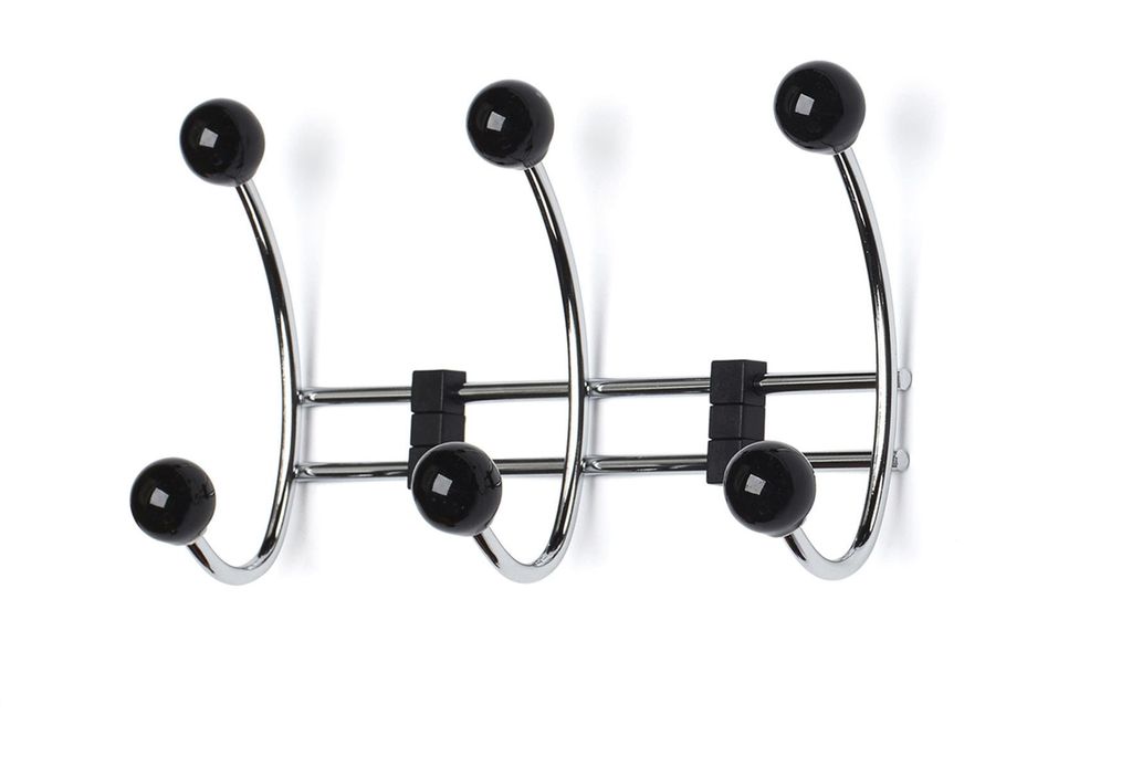 Krokrad av förkromat stål med svarta knoppar av porslin. Passar lika bra i barnrummet som i hallen.