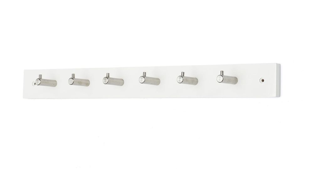 Krokrad på vit högglanslackerad list med krokar i borstat rostfritt stål. Passar för upphängning i hall, sovrum osv.