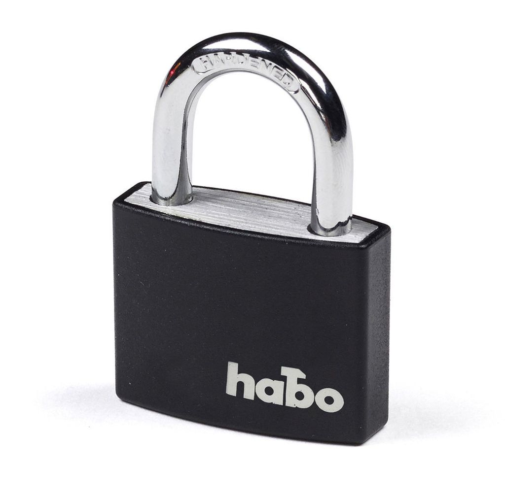 Hänglås av aluminium med svart plastöverdrag. Låset har dubbelreglad Ø 6 mm bygel av härdat stål.