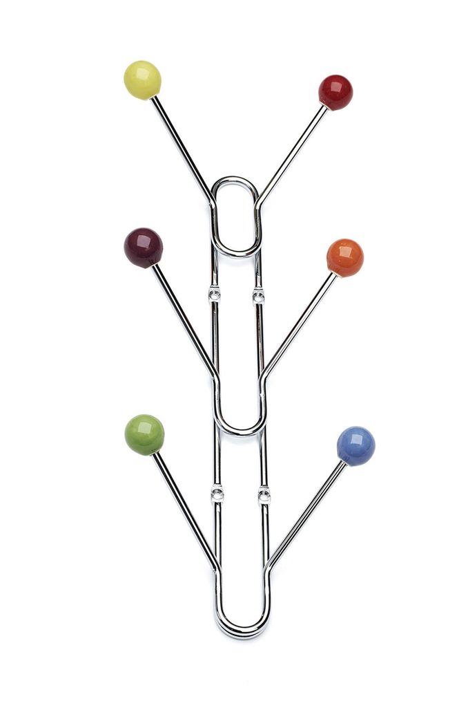 Krokrad av förkromat stål med färgglada knoppar av porslin. Passar lika bra i barnrummet som i hallen.
